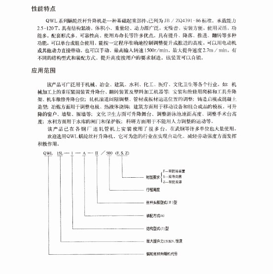 QWL蝸輪絲桿升降機(jī)是一種基礎(chǔ)起重部件,已列為JB/ZQ4391-86標(biāo)準(zhǔn)。承載能力2.5~120T。QWL蝸輪絲桿升降機(jī)具有結(jié)構(gòu)緊湊、體積小、重量輕、動力源廣泛、無噪音、安裝方便、使用靈活、功能多、配套形式多、可靠性高,使用壽命長等許多優(yōu)點,具有提升、降落、推進(jìn)、翻轉(zhuǎn)等多種功能。QWL蝸輪絲桿升降機(jī)能按一定程序準(zhǔn)確地控制調(diào)整攬或或推進(jìn)的高度,可以用電動機(jī)或其他動力直接帶動。也可以手動,最高輸入轉(zhuǎn)速1500r/min,最大提升速度2.7m/min。有不同的結(jié)構(gòu)型式和裝配方式,提升高度按用戶的要求制造,該裝置可以自鎖。