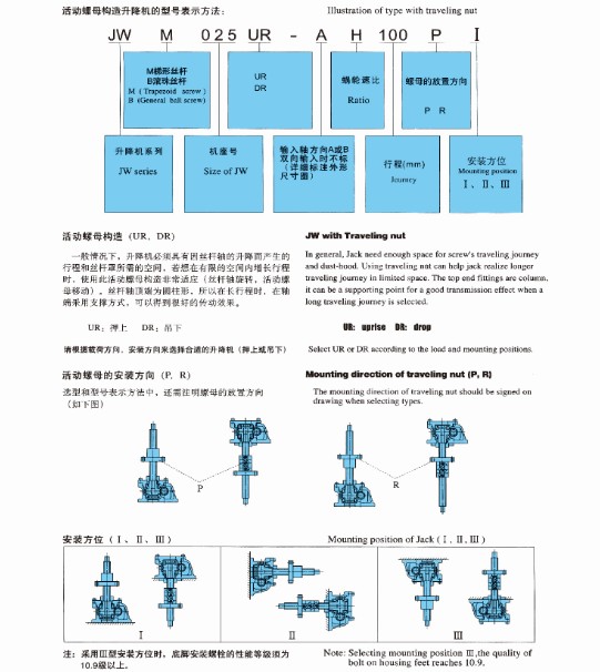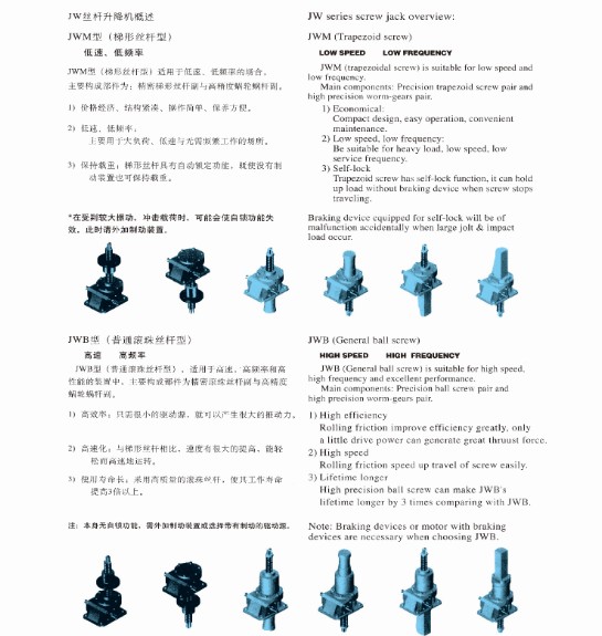 JWM絲桿升降機(jī)適用于低速低頻工況,廣泛應(yīng)用于機(jī)械、冶金、建筑、水利設(shè)備等行業(yè),具有起升、下降及借助輔件推進(jìn)、翻轉(zhuǎn)及各種高度位置調(diào)整等諸多功能。JWM蝸輪絲桿升降機(jī)是一種基礎(chǔ)起重部件,具有結(jié)構(gòu)緊湊、體積小、重量輕、動(dòng)力源廣泛、無(wú)噪音、安裝方便、使用靈活、功能多、配套形式多、可靠性高、使用壽命長(zhǎng)等許多優(yōu)點(diǎn)??梢詥闻_(tái)或組合使用,能按一定程序準(zhǔn)確地控制調(diào)整提升或推進(jìn)的高度,可以用電動(dòng)機(jī)或其它動(dòng)力直接帶動(dòng),也可以手動(dòng)。它有不同的結(jié)構(gòu)形式和裝配形式,且提升高度可按用戶(hù)的要求定制。